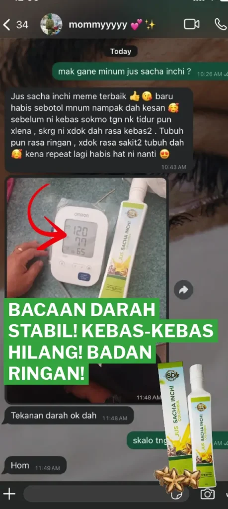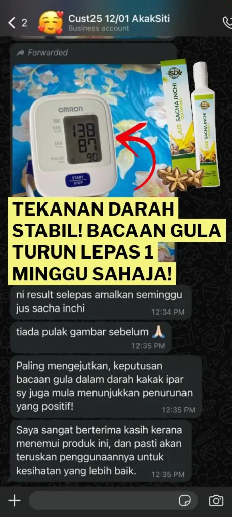 🌟 “Dulu, ada kolestrol tinggi dan darah tinggi. Selepas minum Jus Sacha Inchi, saya mula melihat perbezaan besar! Sekarang dah minum botol ke-5” – Puan Wan Rohaya Binti Megat Hamid, Taiping, Perak.